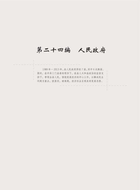 第二十四编 人民政府 1989 年~ 2013 年,县人民政府历经 7 届,其中 6 次换届。 期间,在中共三门县委的领导下,在县人大和县政协的监督支 持下,带领全县人民,围绕发展经济的中心工作,以解决民生 问题为重点,抓落实,破难题,经济社会呈现良好发展态势。