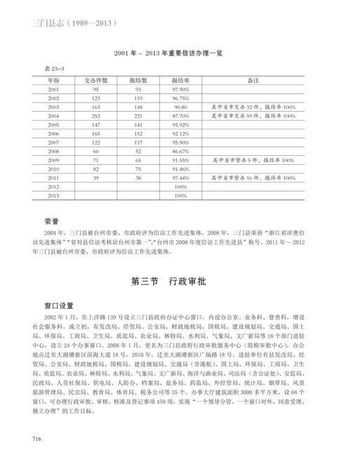访先进集体”“省对县信访考核居台州市第一”,“台州市 2008 年度信访工作先进县”称号。2011 年~ 2012