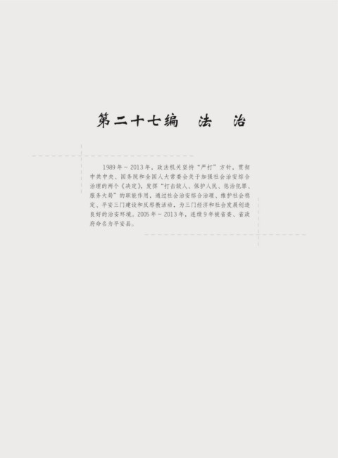 第二十七编 法 治 1989 年~ 2013 年,政法机关坚持“严打”方针,贯彻 中共中央、国务院和全国人大常委会关于加强社会治安综合 治理的两个《决定》,发挥“打击敌人、保护人民、惩治犯罪、 服务大局”的职能作用,通过社会治安综合治理、维护社会稳 定、平安三门建设和反邪教活动,为三门经济和社会发展创造 良好的治安环境。2005 年~ 2013 年,连续 9 年被省委、省政 府命名为平安县。