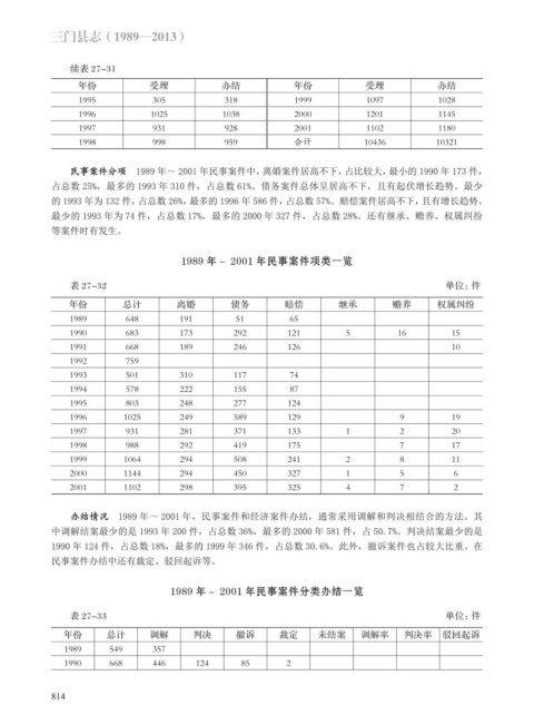 办结情况 1989 年~ 2001 年,民事案件和经济案件办结,通常采用调解和判决相结合的方法。其