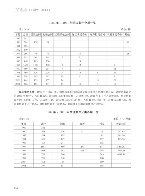 经济案件办结 1989 年~ 2001 年,调解结案和判决结案是经济案件办结的主要方式。调解结案最少