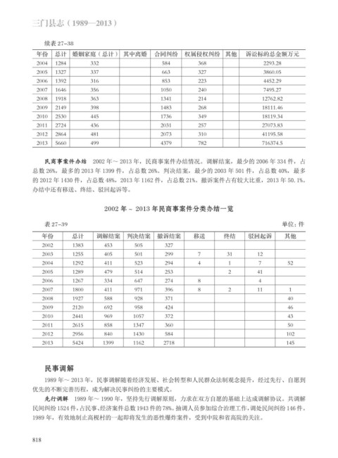 民商事案件办结 2002 年~ 2013 年,民商事案件办结情况。调解结案,最少的 2006 年 334 件,占