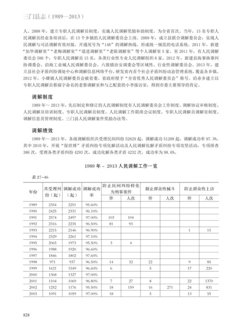 1989 年~ 2013 年,各级调解组织共受理民间纠纷 52629 起,调解成功 51208 起,调解成功率 97.3%。