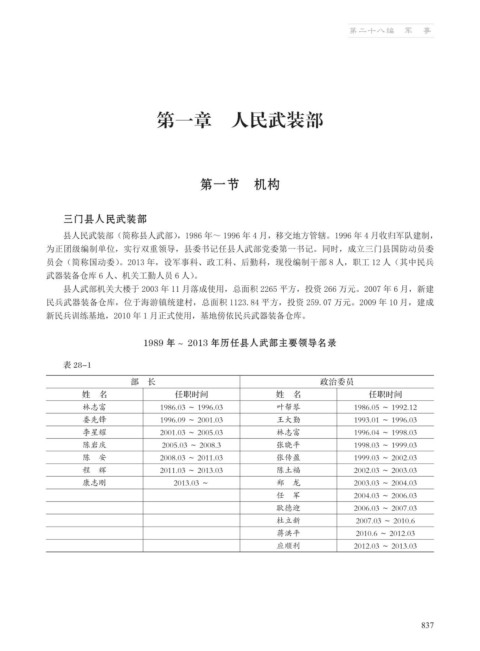 为正团级编制单位,实行双重领导,县委书记任县人武部党委第一书记。同时,成立三门县国防动员委