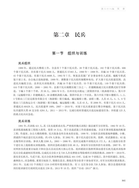 444 个基干民兵班。2000 ~ 2001 年,县基干民兵规模压缩三分之一。在健跳镇成立民兵便携式防空导弹