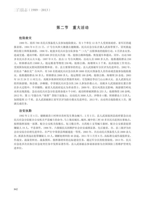 多名民兵扑灭山火 9 起。1997 年 8 月,抗击 11 号台风期间,出动人员 5000 多人次,抢救遇险群众 250