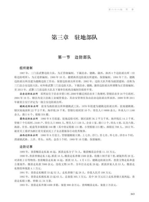 1987 年,三门县武警边防大队,为正营级编制。下属沿赤、健跳、蒲西、渔西 4 个边防派出所(旧