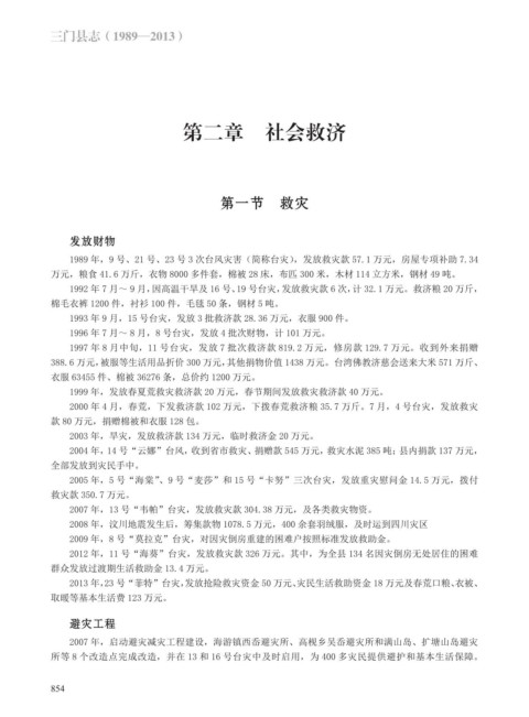 1989 年,9 号、21 号、23 号 3 次台风灾害(简称台灾),发放救灾款 57.1 万元,房屋专项补助 7.34