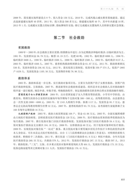 2003 年,临时救济 4560 人。2007 年,慈善机构救助特困群众资金 61.67 万元。2011 年,救助困难移民