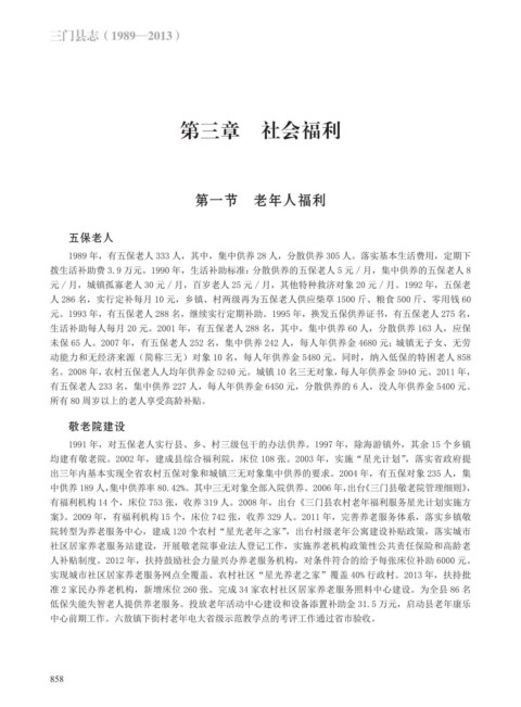 拨生活补助费 3.9 万元。1990 年,生活补助标准:分散供养的五保老人 5 元 / 月,集中供养的五保老人 8