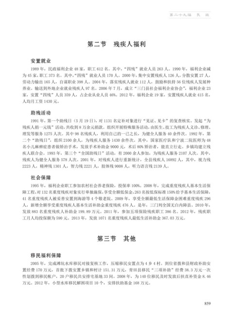 发放 883 名重度残疾人补助金 199.89 万元。2011 年,参加五项保险残疾职工 386 名。2012 年,残疾职