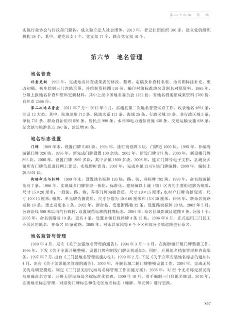 岛形成命名方案,开展无居民海岛名称标准化管理。2009 年 10 月,着手编制三门县地名规划。2010 年,