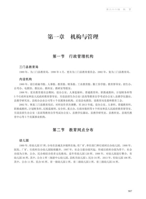 2002 年,恢复三门县教育局后,对科室作多次调整。至 2013 年底,设办公室、人事科、普通教育科、