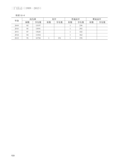 三门县志(1989—2013) 续表 32-8 幼儿园 初中 普通高中 职业高中 年份 园数 学生数 校数 学生数 校数 学生数 校数 学生数 2009 82 13197 1 238 2010 85 13091 1 292 2011 87 13620 1 322 2012 84 11554 1 362 2013 95 10758 1 191 1 378 920