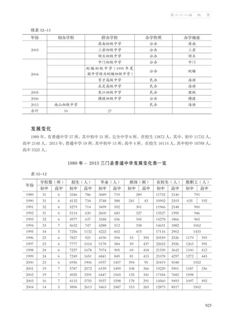1989 年~ 2013 三门县普通中学发展变化表一览