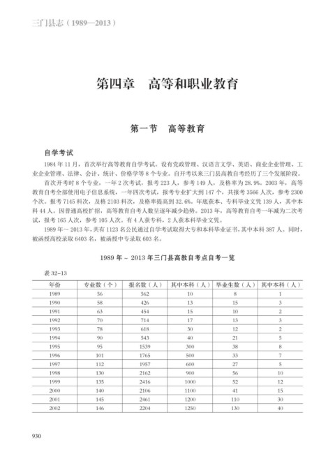 1989 年~ 2013 年,共有 1123 名公民通过自学考试取得大专和本科毕业证书,其中本科 387 人。同时,