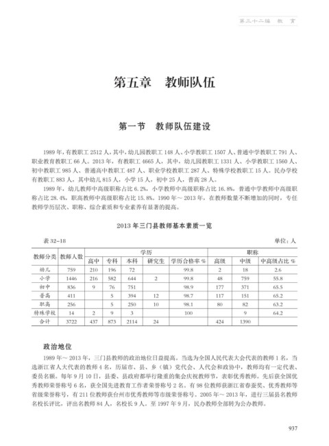 1989 年~ 2013 年,三门县教师的政治地位日益提高。当选为全国人民代表大会代表的教师 1 名,当