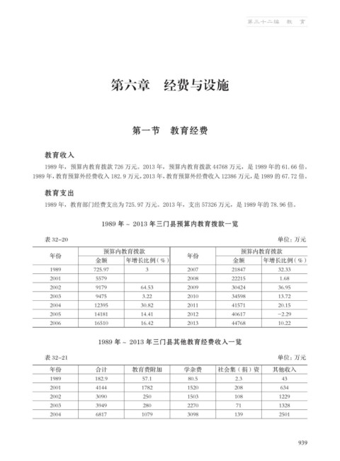 1989 年,教育部门经费支出为 725.97 万元。2013 年,支出 57326 万元,是 1989 年的 78.96 倍。
