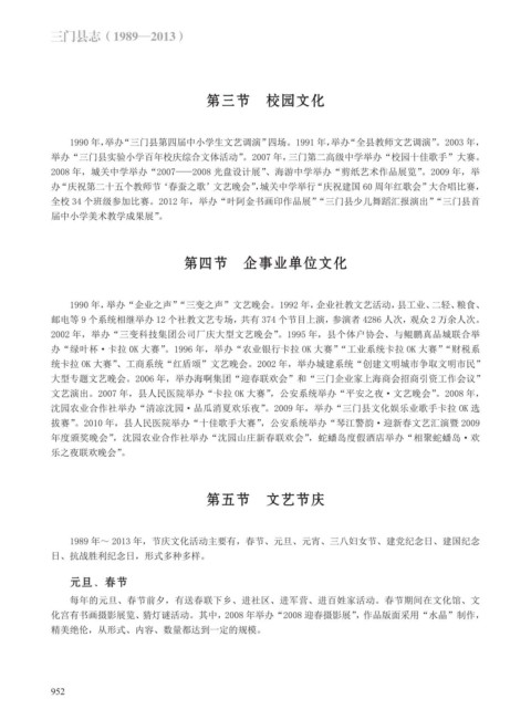 文艺演出。2007 年,县人民医院举办“卡拉 OK 大赛”,公安系统举办“平安之夜·文艺晚会”。2008 年,