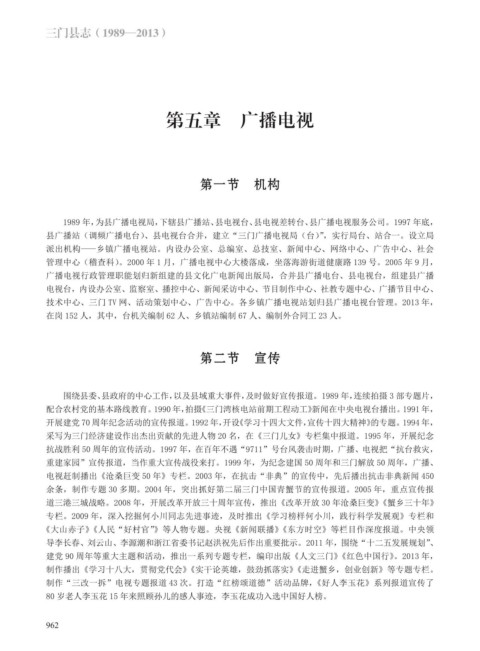 技术中心、三门 TV 网、活动策划中心、广告中心。各乡镇广播电视站划归县广播电视台管理。2013 年,