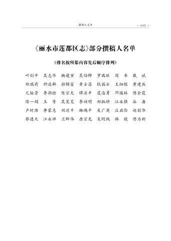 撰稿人名单 · 1547 · 《丽水市莲都区志》部分撰稿人名单 (排名按所纂内容先后顺序排列) 叶剑平 吴志华 杨建寅 吴伯卿 罗瑞旺 周 率 戴 斌 郑瑞有 种道群 颜锦富 黄士昌 钱国云 王细根 黄建兵 尤恒芳 李朝铨 陈宗光 谭洁平 虞海勇 邓国林 傅金霞 陈一娟 王 菁 吴昊炅 李训明 郑淑娇 江永强 谷 潘 卢时唐 李蒙惠 刘进千 杨鸿平 吴广英 庄启俭 赵创华 郭遵天 江永祥 兰鲜伟 唐宗龙 吴刚戟 韩 骁 傅为新
