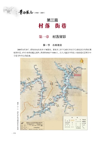 (1988~2007) 第三篇 村 落 街 巷 第一章 村落留影 第一节 水库淹没 2008年4月29日,滩坑水电站水库下闸蓄水。蓄水后,25个行政村和12个行政村部分自然村被 淹没库底, 175个自然村随之消失,共移民8562户31081人。后人只能从当年拍下的村貌村景照片中 寻觅当年存在的踪迹。 图 8-3-1 滩 坑 水 电 站 淹 没 区 示 意 图 · 972