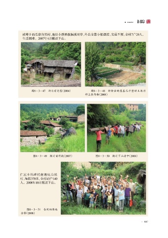 JIUZONG 旧踪 祯埠乡西瓜寮自然村,地处小群渔渡隔溪对岸,外出全靠小船摆渡,交通不便,全村7户29人, 生活困难。2007年4月搬迁下山。 图8-3-47 拆迁前老屋(2004) 图8-3-48 拆除后的屋基已平整好土地并 种上农作物(2008) 图8-3-49 搬迁前村貌(2007) 图8-3-50 搬迁下山途中(2008) 仁宫乡钓滩村南塘底自然 村,海拔370米,全村43户140 人。2008年10月搬迁下山。 图8-3-51 告别祖居地 合影 (2008) · 987