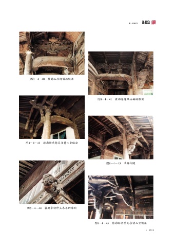 JIUZONG 旧踪 图8-4-40 檐廊二枝轩明栿做法 图8-4-41 檐廊卷蓬串枋蝙蝠雕刻 图8-4-42 檐廊转角骑马雀替三重做法 图8-4-43 单狮牛腿 图8-4-44 檐廊串枋伸头木单狮雕刻 图8-4-45 檐廊转角骑马雀替二重做法 · 1011
