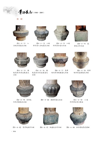 图8-4-82 龟背纹鼓形石础 图8-4-83 松鹿纹方形石础 图8-4-84 牡丹花纹高足檐础