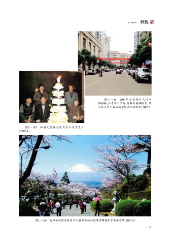 GAIMAO 概貌 图1-166 2007年全县有私人汽车 7603辆,其中不乏宝马、奔驰等高档轿车。图 为停泊在圣旨街两旁停车位的轿车 (2007) 图1-167 和谐之星敬老院为老人庆贺生日 (2007.4) 图1-168 青田旅游团游客在日本箱根平和公园观赏樱花和富士山雪景(2007.4) · 77