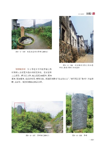 JIUZONG 旧踪 图8-4-105 恢复前后洲头界碑 (2009.6) 图8-4-106 洲头路西(图左)原为青 田县,路东(图右)为永嘉县 界牌坳界碑 位于季宅乡下庄村茅章自然 村和缙云县石笕乡南山岭村交界处,青田至缙 云古道旁。碑为长方体,地上高度160厘米、宽70 厘米、厚20厘米,花岗岩材质,碑体完整。两面阴刻楷书“东至青田县” 、“西至缙云县”各5字,字迹清 晰,无纪年。现仍准确标记两县分界。 图8-4-107 界碑坳 (2009.5) 图8-4-108 界碑 · 1023