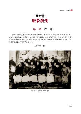 JIUZONG 旧踪 第六篇 服装演变 第一章 衣 裤 20世纪20年代后,服饰演变很快。都市男子服装有袍、褂、袄、衫、裤等,长衫、马褂为主要礼服; 都市妇女盛行穿旗袍、绒线衫、长裙。乡村百姓大都穿麻布、棉布做的长、短衫、裤。40年代后,中山 装在城乡普遍流行。80年代,干部职工盛行穿西装西裤,民众劳作仍穿麻、棉布做的传统衣裤。21世 纪起流行休闲装,干群穿着差异不大。 第一节 衣 图8-6-1 20世纪初教师着装 · 1049
