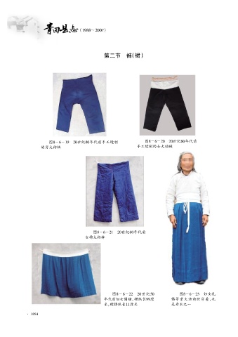 (1988~2007) 第二节 裤 (裙) 图8-6-19 20世纪80年代前手工缝制 图8-6-20 20世纪80年代前 的男大裆裤 手工缝制的女大裆裤 图8-6-21 20世纪80年代前 女棉大裆裤 图8-6-22 20世纪50 图8-6-23 妇女礼 年代前妇女围裙。裙纵长99厘 佛等重大活动时穿着,也 米,裙腰纵长11厘米 是寿衣之一 · 1054