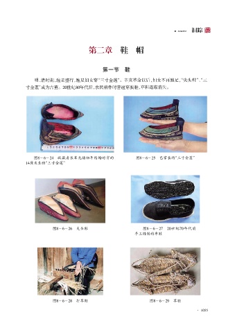 JIUZONG 旧踪 第二章 鞋 帽 第一节 鞋 “ 明、清时期,缠足盛行,缠足妇女穿“三寸金莲” 。辛亥革命以后,妇女不再缠足,尖头鞋”、“三 寸金莲”成为古董。20世纪80年代后,农民耕作时普遍穿胶鞋,草鞋逐渐消失。 图8-6-24 收藏者长辈光绪初年结婚时穿的 图8-6-25 巴掌长的“三寸金莲” 14厘米长的“三寸金莲” 图8-6-26 尖头鞋 图8-6-27 20世纪70年代前 手工缝制的布鞋 图8-6-28 打草鞋 图8-6-29 草鞋 · 1055