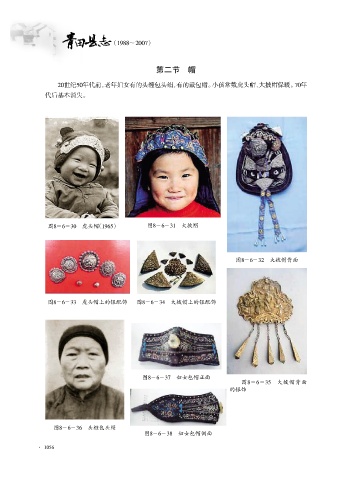 (1988~2007) 第二节 帽 20世纪50年代前,老年妇女有的头缠包头绢,有的戴包帽。小孩常戴虎头帽、大披帽保暖。 70年 代后基本消失。 图8-6-30 虎头帽 (1965) 图8-6-31 大披帽 图8-6-32 大披帽背面 图8-6-33 虎头帽上的银配饰 图8-6-34 大披帽上的银配饰 图8-6-37 妇女包帽正面 图8-6-35 大披帽背面 的银饰 图8-6-36 头缠包头绢 图8-6-38 妇女包帽侧面 · 1056