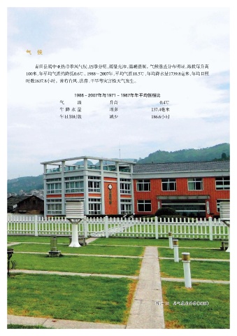 GAIMAO 概貌 气 候 青田县属中亚热带季风气候,四季分明,雨量充沛,温暖湿润。气候垂直分布明显,海拔每升高 100米,年平均气温约降低0郾6℃。1988~2007年,平均气温18郾5℃,年均降水量1739郾8毫米,年均日照 时数1637郾8小时。常有台风、洪涝、干旱等灾害性天气发生。 1988~2007年与1971~1987年年平均值相比 气 温 升高 0郾4℃ 年 降 水 量 增多 137郾4毫米 年日照时数 减少 186郾6小时 图 县气象局外景( )