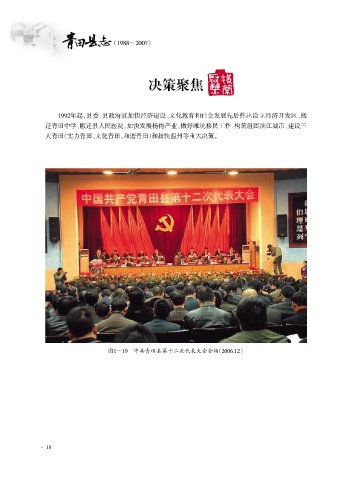 (1988~2007) 决策聚焦 1992年起,县委、县政府就加快经济建设、文化教育和社会发展先后作出设立经济开发区、搬 迁青田中学、搬迁县人民医院、加快发展杨梅产业、做好滩坑移民工作、构筑组团滨江城市、建设三 大青田(实力青田、文化青田、和谐青田)和接轨温州等重大决策。 图1-19 中共青田县第十二次代表大会会场(2006.12) · 18