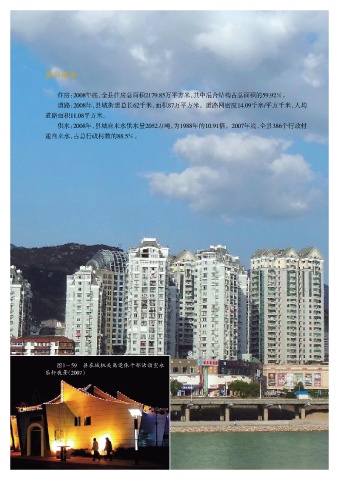 (1988~2007) 城乡建设 住房: 2008年底,全县住房总面积2179郾85万平方米,其中混合结构占总面积的59郾92%。 道路:2008年,县城街道总长62千米,面积87万平方米。道路网密度14郾09千米/平方千米,人均 道路面积11郾08平方米。 供水:2008年,县城自来水供水量2052万吨,为1988年的10郾91倍。2007年底,全县386个行政村 通自来水,占总行政村数的88郾5%。 图1-59 县在城机关离退休干部活动室永 乐轩夜景(2007)