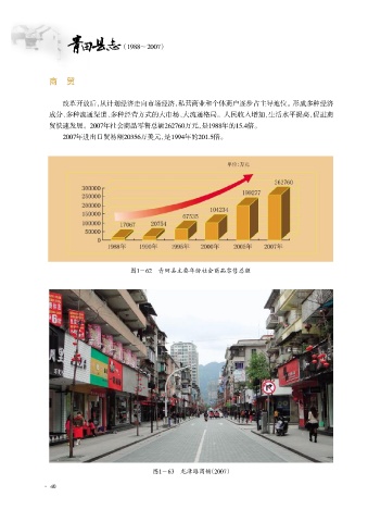 (1988~2007) 商 贸 改革开放后,从计划经济走向市场经济,私营商业和个体商户逐步占主导地位。 形成多种经济 成分、多种流通渠道、多种经营方式的大市场、大流通格局。人民收入增加,生活水平提高,促进商 贸快速发展。2007年社会商品零售总额262760万元,是1988年的15郾4倍。 2007年进出口贸易额20356万美元,是1994年的201郾5倍。 图1-62 青田县主要年份社会商品零售总额 图1-63 龙津路商铺(2007) · 40