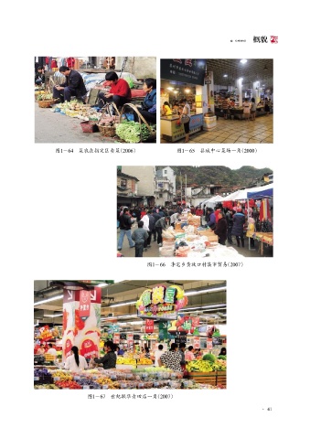 GAIMAO 概貌 图1-64 菜农在指定区卖菜(2006) 图1-65 县城中心菜场一角(2000) 图1-66 季宅乡黄放口村集市贸易(2007) 图1-67 世纪联华青田店一角(2007) · 41