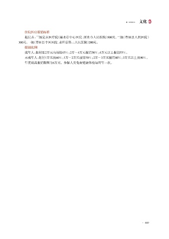 WENHUA 文化 住院医疗报销标准 起付点:三级定点医疗院(丽水市中心医院、丽水市人民医院) 500元,二级(青田县人民医院) 300元,一级(青田县中医医院、青田县第二人民医院) 200元。 报销比例 成年人:起付至2万元内报销45%;2万~4万元报销50%;4万元以上报销55%。 未成年人:起付1万元报60%;1万~2万元报销70%;2万~3万元报销80%;3万元以上报90%。 年度最高报销限额为6万元。参保人员免费健康体检每两年一次。 · 669