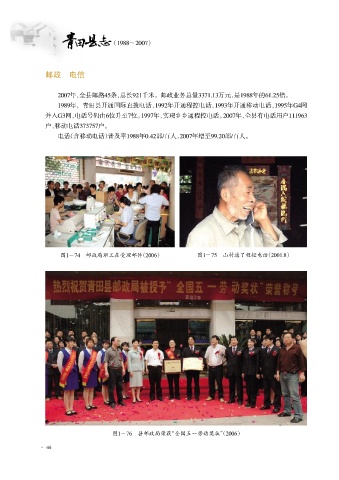 图1-74 邮政局职工在受理邮件(2006) 图1-75 山村通了程控电话(2001.8)