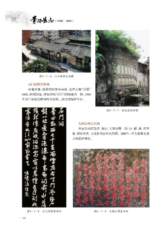(1988~2007) 图5-7-6 山口镇林宅鸟瞰 石门洞摩崖碑刻 布勒在旗、鼓两峰的摩崖16处,龙潭左侧 “月洞” 64处,碑刻25通。摩崖碑刻与石门仙境融为一体。 1963 年石门洞摩崖碑刻列为省第二批文物保护单位。 图5-7-7 林宅后院照壁 太鹤山摩崖石刻 摩崖石刻有题名、题记、人物刻像三类,行、楷、篆、草皆 备,颇有历史、文化和书法研究价值。2005年,列为省第五批 文物保护单位。 图5-7-8 石门洞摩崖碑刻 图5-7-9 太鹤山摩崖石刻 · 722