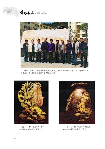 (1988~2007) 图6-1-46 文化部副部长赵少华(左五),省文化厅厅长杨建新 (左四),青田县县长 徐光文(左二)考察青田石雕艺术学校 (2009.5) 图6-1-47 学生作品:嫩芽 图6-1-48 学生作品:梅花瓶 2008级石雕(1)班陈柳巧(女)作 2008级石雕(1)班厉秋华(女)作 · 758