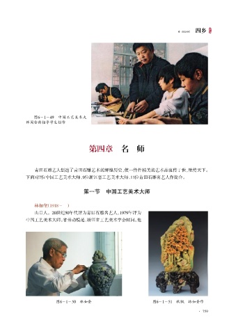 SIXIANG 四乡 图6-1-49 中国工艺美术大 师周金甫指导学生创作 第四章 名 师 青田石雕艺人创造了青田石雕艺术的辉煌历史,使一件件精美的艺术品流传于世,艳传天下。 下面对7位中国工艺美术大师、 9位浙江省工艺美术大师、 11位青田石雕名艺人作简介。 第一节 中国工艺美术大师 林如奎(1918~ ) 山口人。20世纪50年代评为青田石雕名艺人,1979年评为 中国工艺美术大师。省劳动模范、浙江省工艺美术学会顾问。 他 图6-1-50 林如奎 图6-1-51 秋枫 林如奎作 · 759