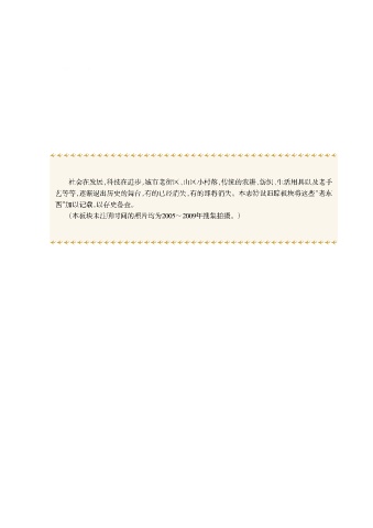 (1988~2007) 社会在发展,科技在进步,城市老街区、山区小村落,传统的农耕、纺织、生活用具以及老手 艺等等,逐渐退出历史的舞台,有的已经消失,有的即将消失。本志特设旧踪板块将这些“老东 西”加以记载,以存史备查。 (本板块未注明时间的照片均为2005~2009年搜集拍摄。)