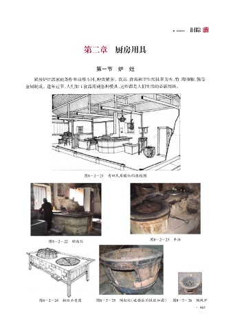 JIUZONG 旧踪 第二章 厨房用具 第一节 炉 灶 厨房炉灶因家庭条件和功用不同,种类繁多。炊具、食具和卫生用具多为木、竹、陶和铜、锡等 金属制成。逢年过节,人们加工食品用到各种模具,这些都是人们生活的必需用具。 图8-2-21 青田民居镬灶间透视图 图8-2-23 平灶 图8-2-22 烟囱灶 图8-2-24 抬灶示意图 图8-2-25 陶缸灶(破损后用铁丝加固) 图8-2-26 陶风炉 · 963