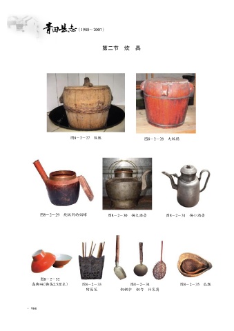 (1988~2007) 第二节 炊 具 图8-2-27 饭甑 图8-2-28 大饭桶 图8-2-29 烧饭用的铜罐 图8-2-30 锡大酒壶 图8-2-31 锡小酒壶 图8-2-32 高脚碗(脚高2郾5厘米) 图8-2-33 图8-2-34 图8-2-35 瓜瓢 陶筷笼 铜锅铲 铜勺 竹笊篱 · 964