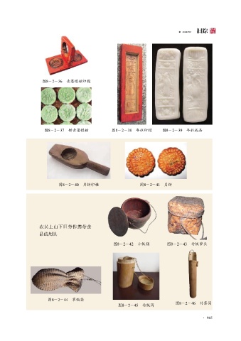 JIUZONG 旧踪 图8-2-36 青蓬馍糍印模 图8-2-37 甜青蓬馍糍 图8-2-38 年糕印模 图8-2-39 年糕成品 图8-2-40 月饼印模 图8-2-41 月饼 农民上山下田劳作携带食 品的用具 图8-2-42 小饭桶 图8-2-43 竹饭箩头 图8-2-44 草饭袋 图8-2-45 竹饭筒 图8-2-46 竹茶筒 · 965