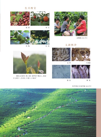 长 兴 四 宝 板 栗 吊 瓜 采葡萄(2011年) 太 湖 四 珍 青 梅 白 果 白 虾 大闸蟹 唐陆羽《茶经·茶之源》:紫笋茶“紫者上,绿者 次;笋者上,牙者次;叶卷上,叶舒次” 银 鱼 鲚 鱼 和平茶山(任丽萍摄·2009年)